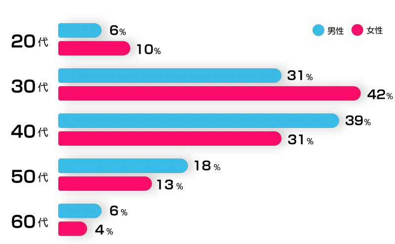 女性の会員様が最も多い年齢は、30代です。40代おすすめ婚活