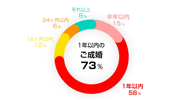 1年以内にご成婚された会員様の割合は73%です。多くの会員様が1年以内に成婚退会という幸せをつかんでいます。中には半年以内のご成婚も見られるほど、積極的に婚活をされている特徴があります。会員様の成婚までの道のりは様々ですが、統計的に見てお見合いが1週間以内に決まる方や、お見合いから交際に発展するまでに1ヶ月以内の方もたくさんいます。
