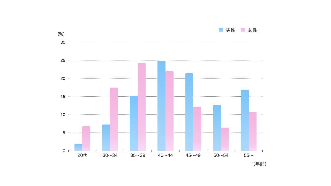 女性の会員様が最も多い年齢は、30代です。