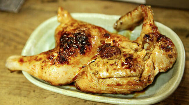 店内も昭和の雰囲気そのもので、焼き鳥の香ばしい香りを路地に漂わせています。名物の「新子焼き」(1,380円)は若鶏の半身を素焼きにして味付けをした料理です。