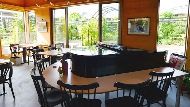 薔薇の庭園に囲まれた非日常感あふれる空間で、グランドピアノの生演奏も行われており、耳と心も満たすひとときを過ごせるカフェです。店内席・テラス席と選べる構成で、陽の光や庭の緑を感じながらゆったり会話できる設計。