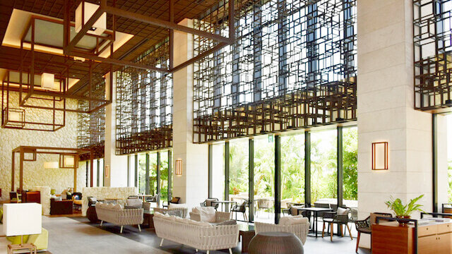ビーチリゾートとして開業したハイアットリージェンシー瀬良垣アイランド 沖縄のホテルラウンジです。吹き抜けになった広くて開放的な空間と、南国の木々の合間から見える海、洗練されたリゾートを感じさせてくれます。テラス席にも、陽の光を浴びてくつろげる、ゆとりのあるソファ席が用意されています。