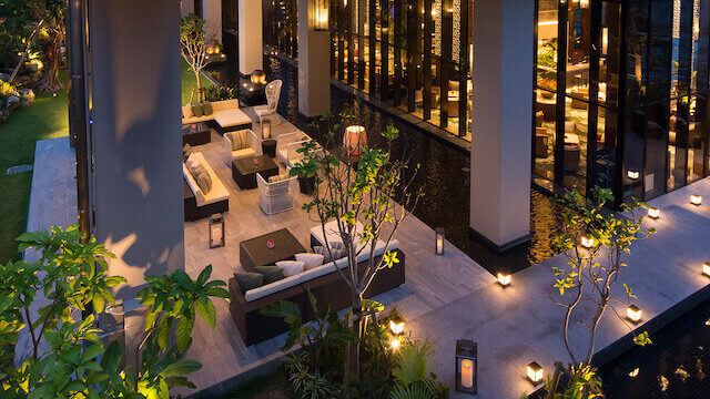 高級ホテル「ザ・ブセナテラス」のラグジュアリーなホテルラウンジです。プールやビーチを見下ろすリゾート空間で、英国スタイルの優雅なアフタヌーンティーやホテルメイドのスイーツなどをゆったりと楽しめるようなお見合い場所です。