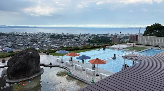 別府の宿泊先は、オリックスの『杉乃井ホテル』。プールが2つもあって、温泉も広くて、大浴場から見る眺めは絶景です。