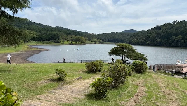 『金鱗湖』はキャンプ地としてものどかな場所で、ソフトクリームを食べながらのんびり。