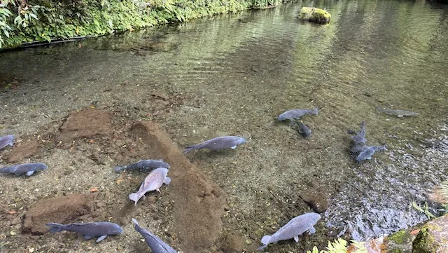 キレイな川には鯉……と思いきや、しっかり見てみると、やたらと大きい。地元の人に聞いてみると、チョウザメだそうで、この川だからこそ生息できているそうです。